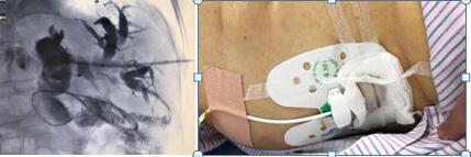在放射介入科的帮助下,首先行经皮肝穿刺置管引流术(PTCD),术后梁婆婆腹痛、发热、黄疸随即较入院前好转。术后经过5天抗感染、营养支持等治疗,梁婆婆的身体较入院前明显好转。