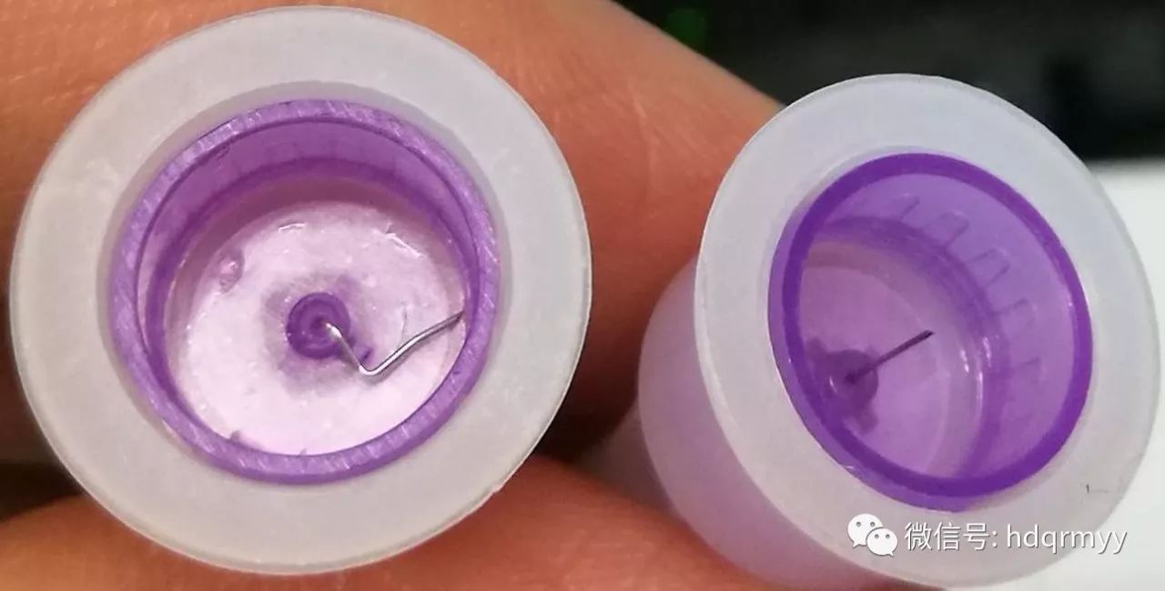 图3弯曲的胰岛素内针头(左)与正常的胰岛素内针头(右)