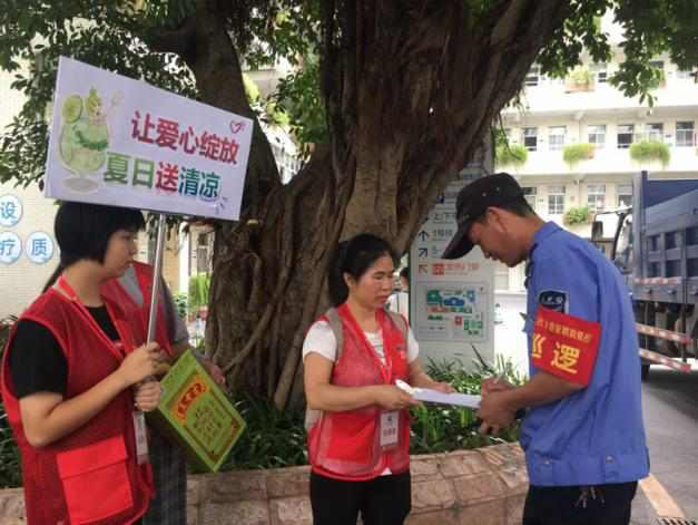 8月17日,花人医志愿者走到三个院区,给那些不畏高温酷暑、仍然坚守在生产、基建一线辛勤工作的本院户外工作者送去夏日清凉、送去人文关怀。关爱范围扩大到院外环卫工人、交警同志、城管同志、外卖快递小哥等,在三个院区沿着指定路线为高温下仍奋斗在一线的户外工作者们免费提供清凉饮料,希望能给他们送去一丝清凉。