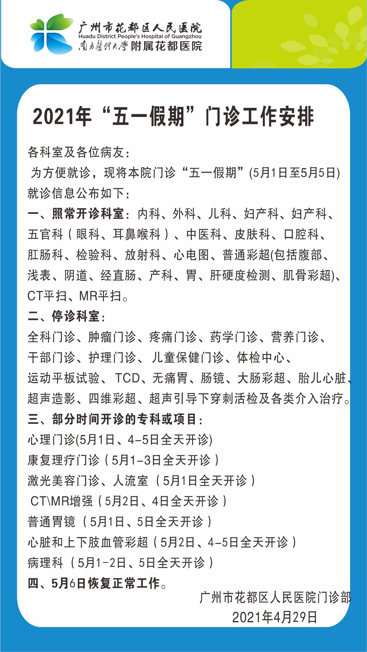 2021年“五一”假期门诊工作安排